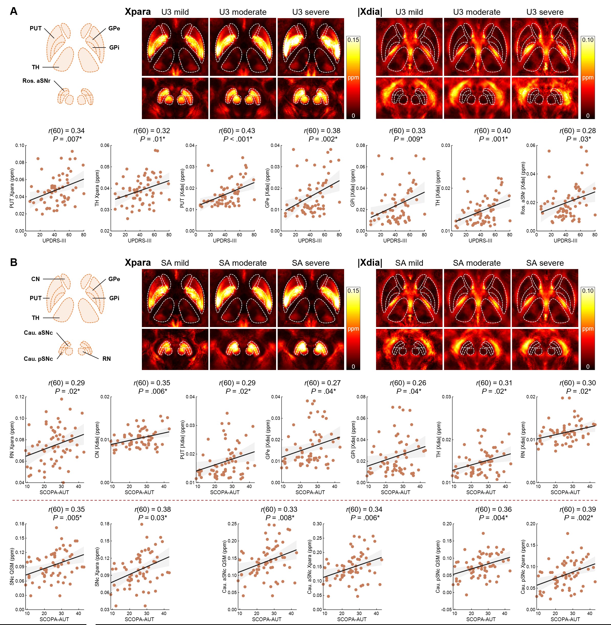 进一步分析揭示了α-Syn蛋白聚集与铁沉积在不同突触核蛋白病中的空间分布差异:PD患者的磁化率异常主要集中于黑质致密部;而MSA患者中的异常则更广泛分布于基底节、中脑及小脑等多个运动相关脑区。相关性分析进一步显示,在MSA患者中,多个脑区的χpara与χdia
