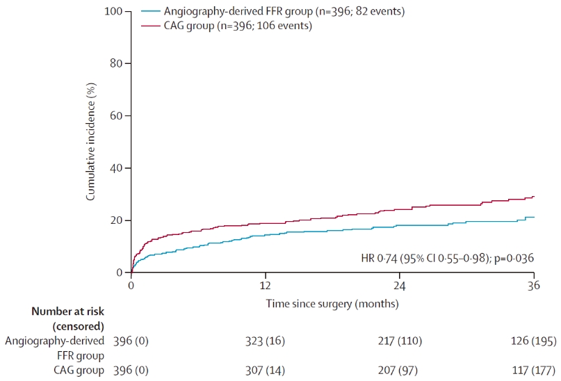 中位随访27个月,造影指导组主要次要终点事件发生率为27%,而QFR指导组发生率为21%, 事件风险相对降低26% (HR 0.74 [95% CI 0.55 - 0.98];P = 0.036;图2)。这一结果有力证明:避免不必要的搭桥手术所带来的获益,在外科术后头两年内,超过了未处理非缺血性病变的潜在风险。值得一提的是,第二代AI赋能的μQFR技术显示出更强的风险区分能力,采用μQFR可将主要终点事件发生率降低45%。