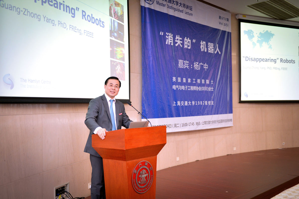 仪式后,杨广中院士做客第59期大师讲坛。他由电影《星球大战》引入,介绍了机器人领域近几十年的发展情况。杨广中院士以农耕机器人为例,阐述了机器人为 人类生活带来的便利,并重点介绍了Surgical Robotics(外科手术机器人)。他通过“达芬奇”机器人的例子指出当前手术机器人的局限——缺乏智能性和针对性,并提出了医疗机器人的发展目标—— “To sense, to act, to adapt, to learn, to evolve, to be intelligent, to disappear”(感知,操控,适应,学习,进化,智能化,最终与人融为一体)。